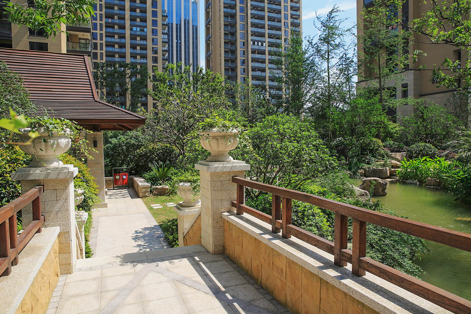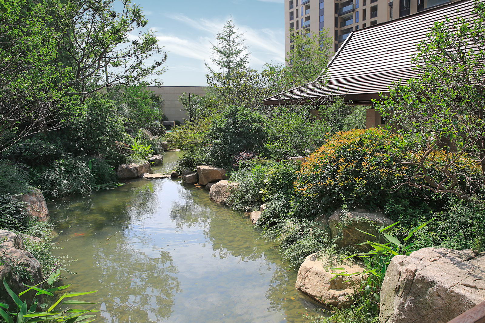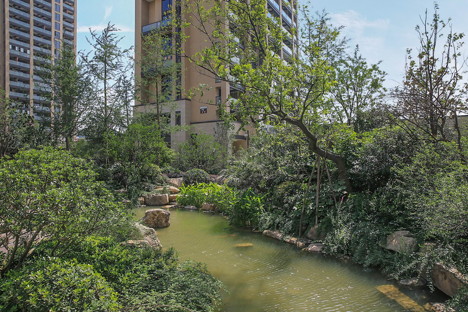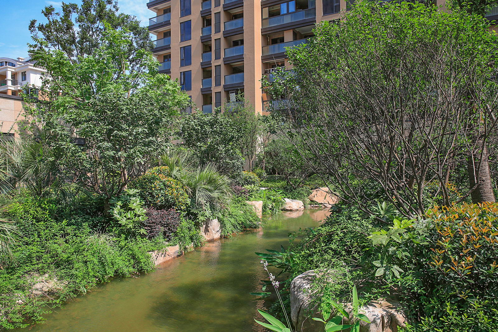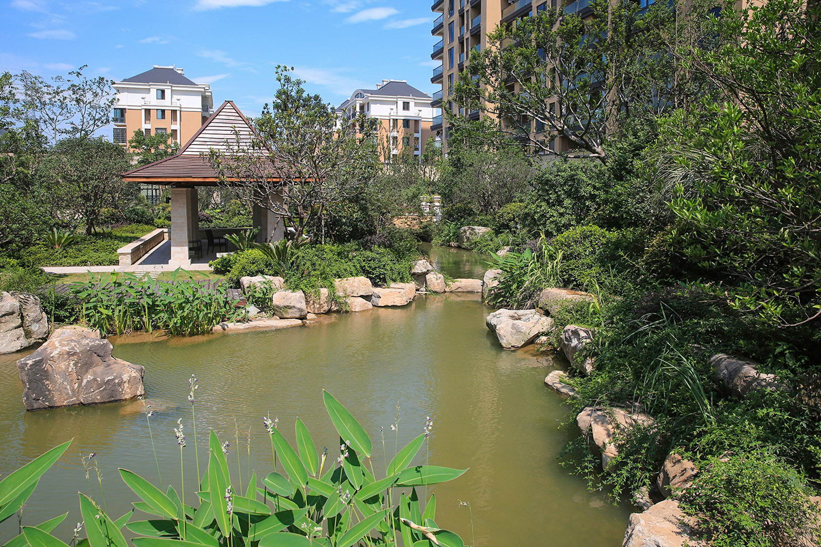 婉約的水系靈動(dòng)變化,植物沿用東南亞風(fēng)情配置手法,自然野趣,營(yíng)造一種氛圍極其輕松的,溫潤(rùn)、自然的都市野奢性生活場(chǎng)景。