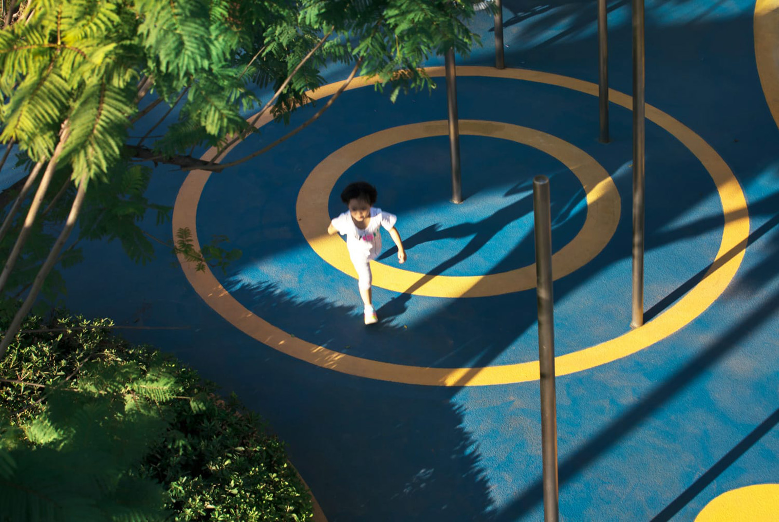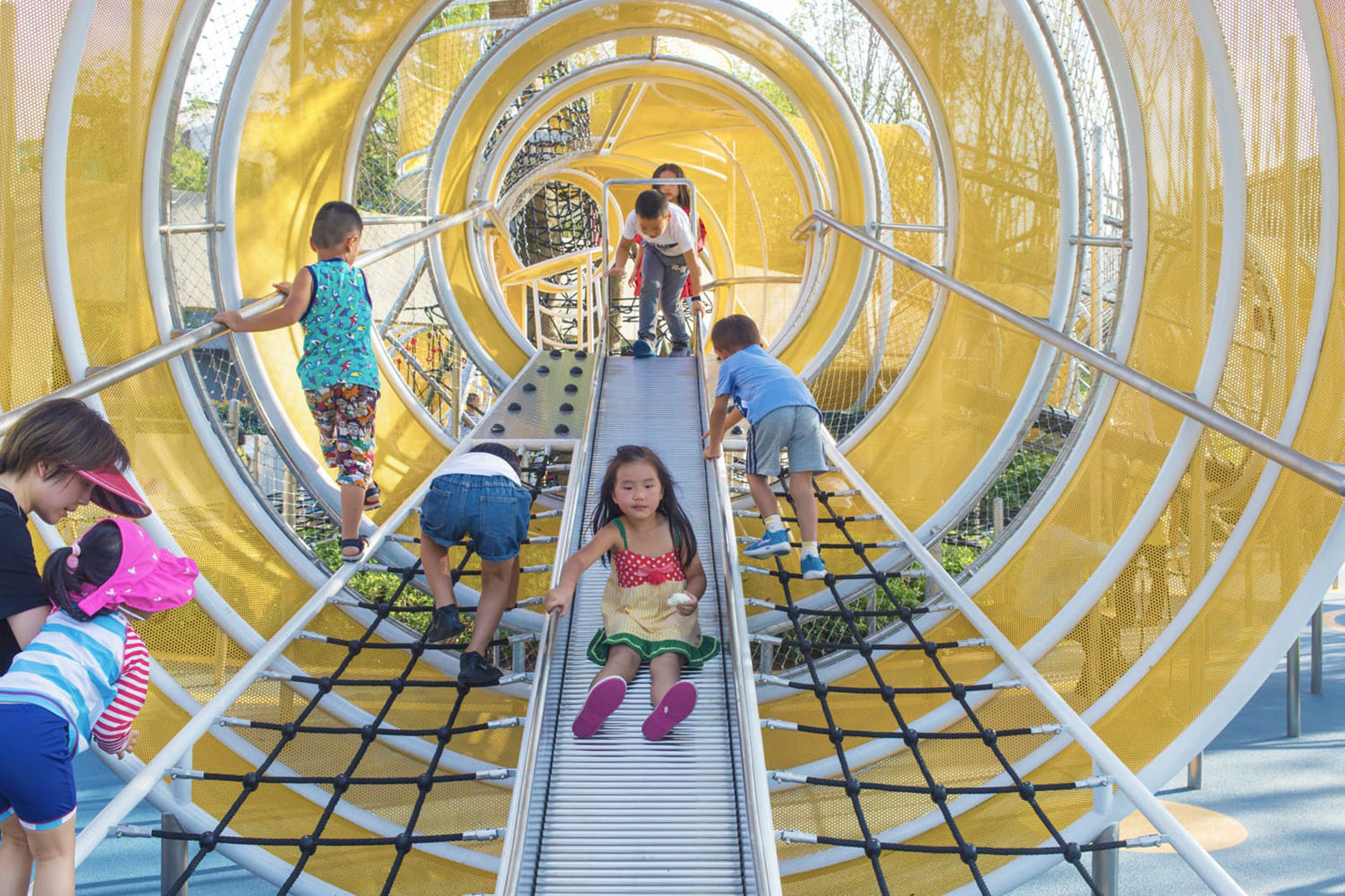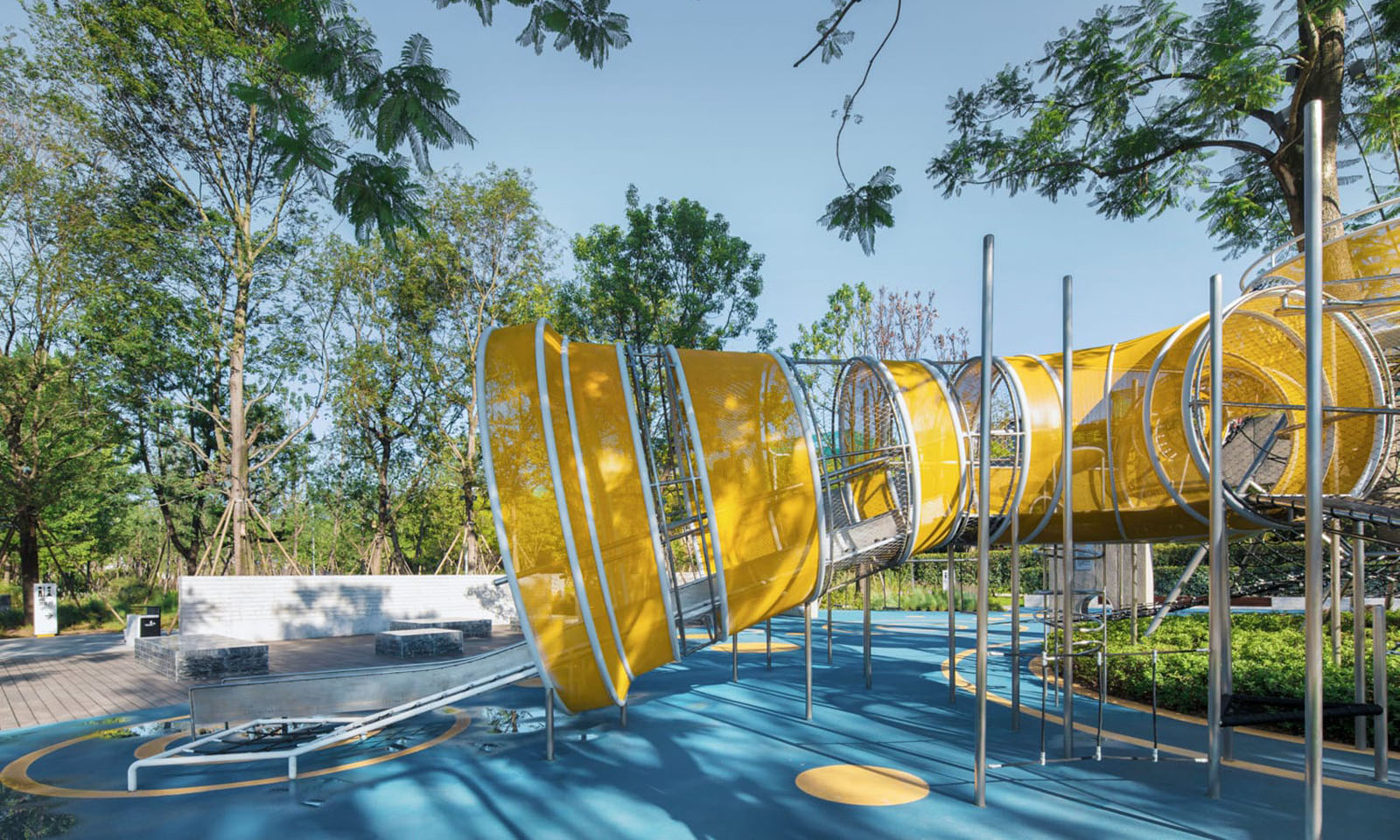 以學(xué)齡大童冒險(xiǎn)為設(shè)計(jì)主題,架空的冒險(xiǎn)管道、吊橋、方盒子滑梯等設(shè)計(jì),激發(fā)兒童的探索欲、合作精神、冒險(xiǎn)精神。拓展兒童的空間想象力。同時(shí)林蔭大樹(shù)與器械相結(jié)合,探險(xiǎn)空間猶如穿梭、浮空在林中,兒童伸手能觸碰到大樹(shù)的枝條,更加增強(qiáng)了兒童與自然的互動(dòng)。