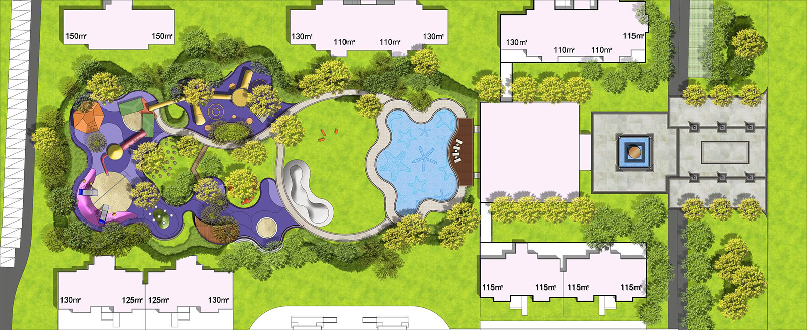 將海星形態(tài)衍化成兒童主題戲水池,池底海星馬賽克鋪裝為兒童講述海星在海洋中茁壯成長(zhǎng)的趣味旅程。