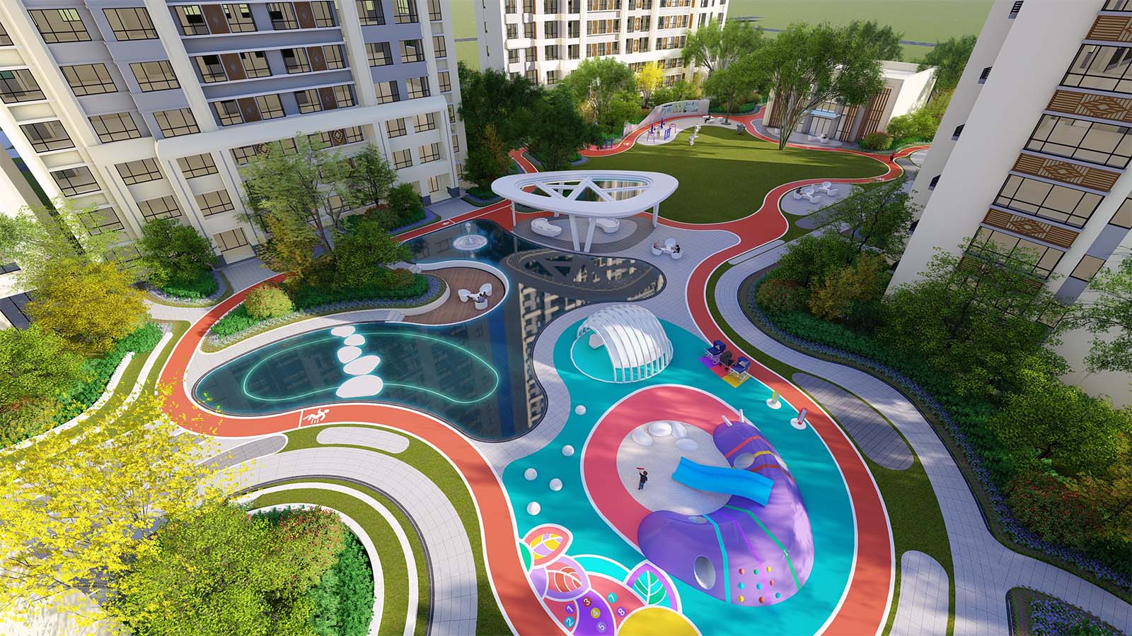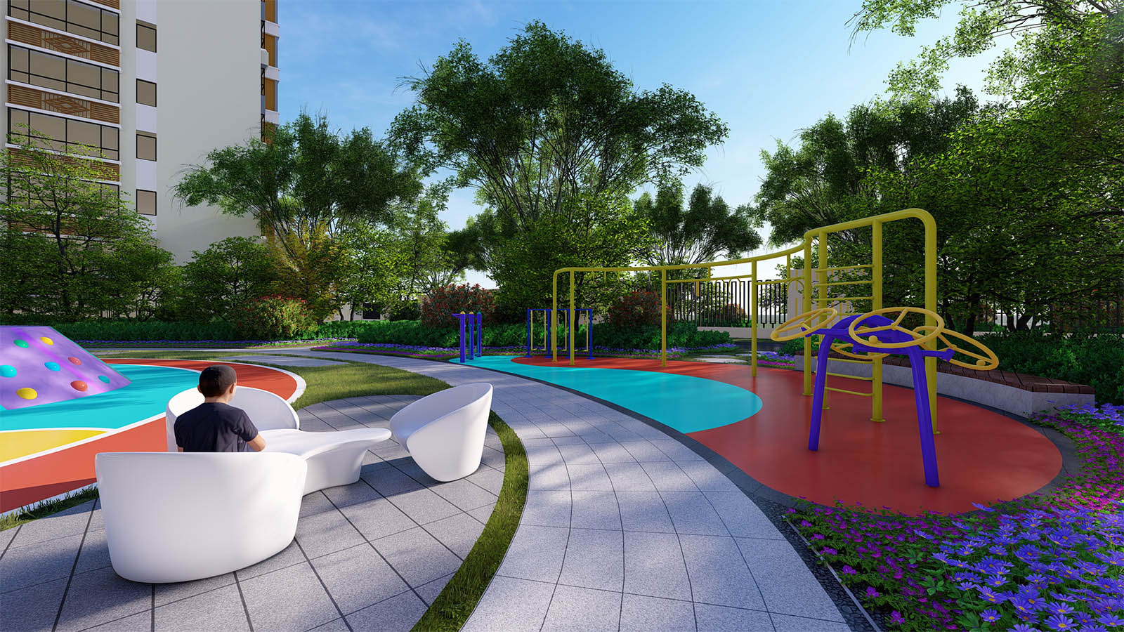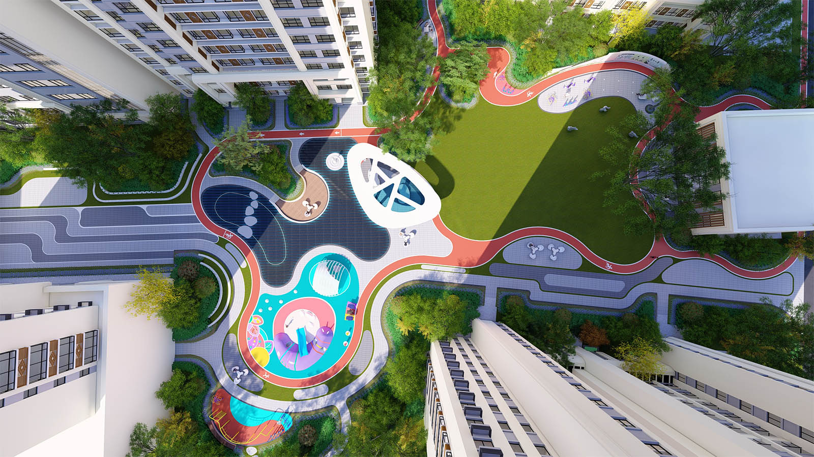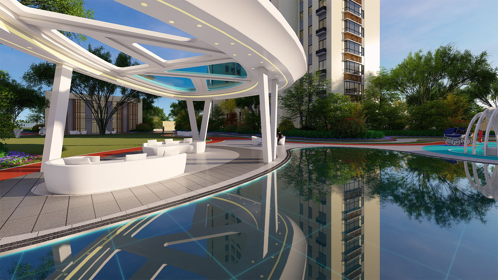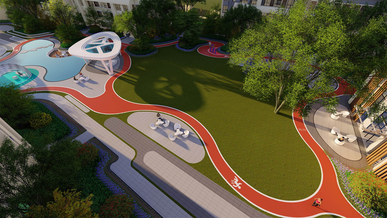 通過柔美曼妙的曲線環(huán)繞形成一片溫馨、和煦、柔軟的開敞空間,陽(yáng)光兼具詩(shī)意,草坪如綠毯般輕柔展開,自然優(yōu)雅,