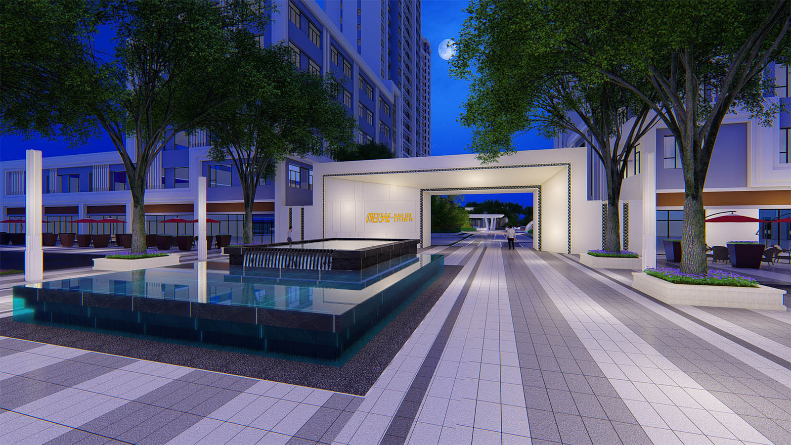 主入口重新梳理原有的商業(yè)車行交通動(dòng)線,通過林蔭樹陣及景觀燈柱的布置,隔離車行動(dòng)線,并引導(dǎo)車流由南北兩處車行入口進(jìn)入,入口廣場(chǎng)采用簡(jiǎn)雅的設(shè)計(jì)手法,保證人行動(dòng)線安全、流暢,布置鏡面疊水水景,結(jié)合景觀樹陣與燈柱營(yíng)造禮儀迎賓氛圍,引導(dǎo)業(yè)主悠然歸家。