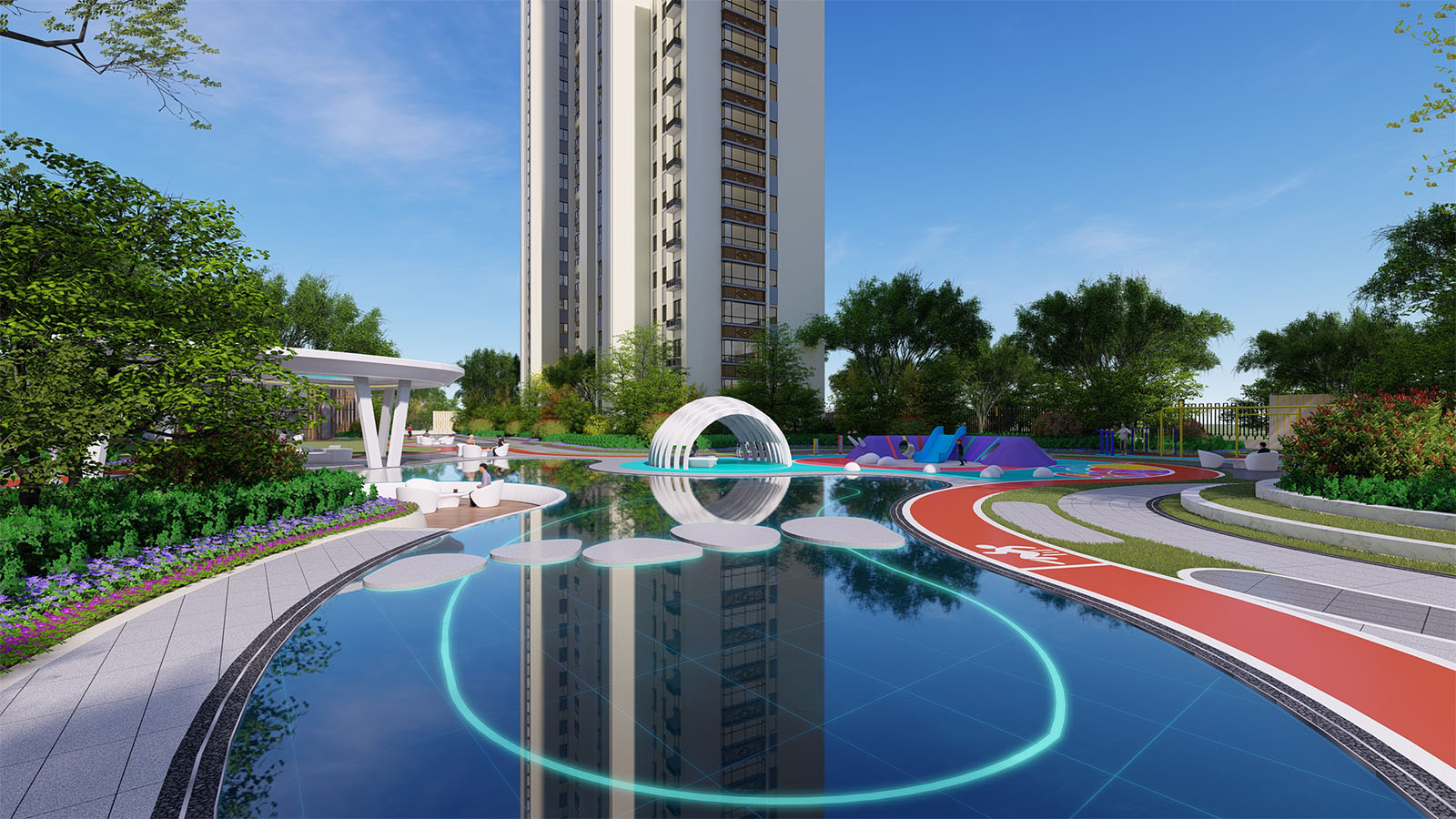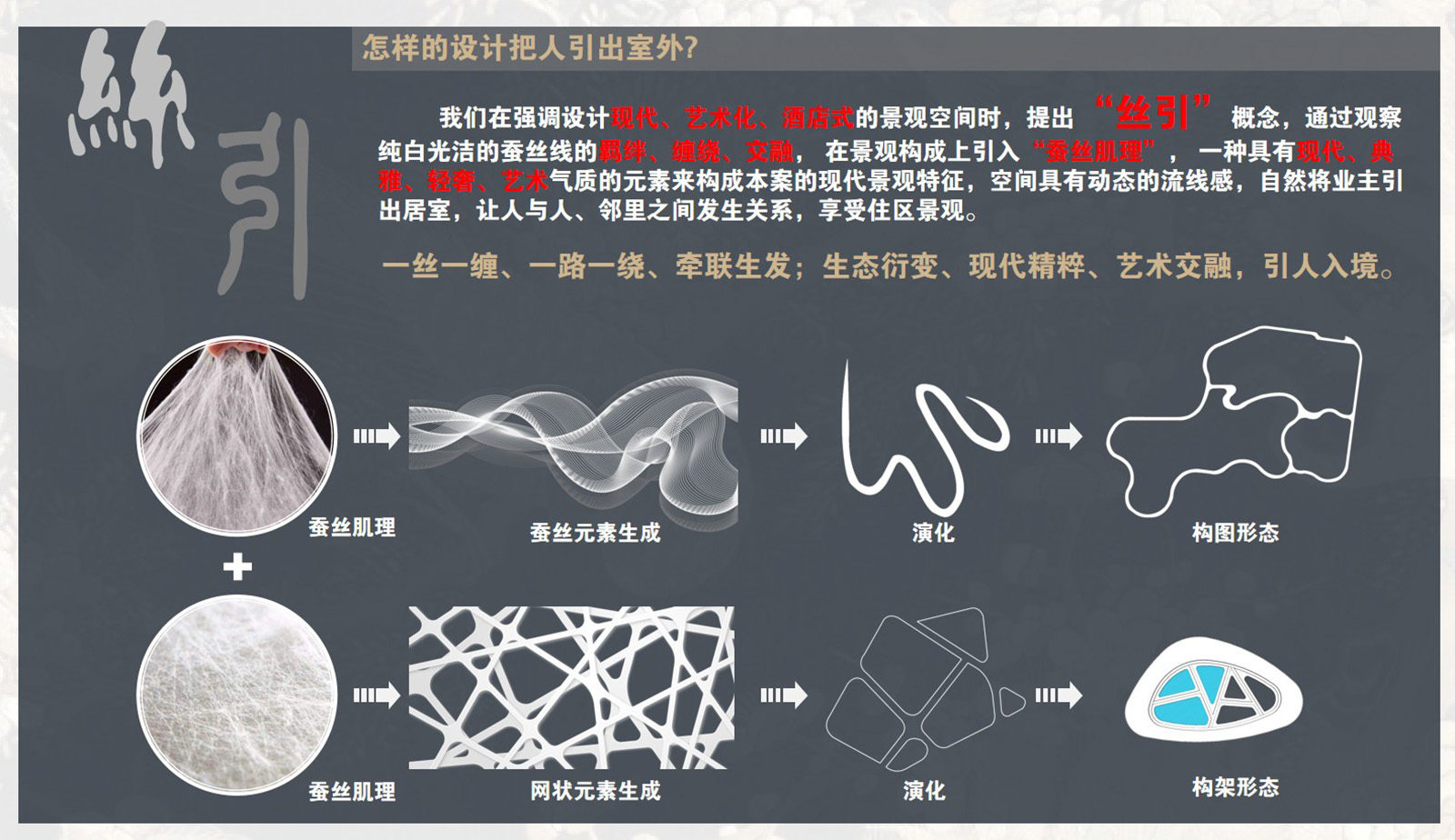 以環(huán)繞式的設(shè)計(jì)手法,梳理鏡面水系脈絡(luò),多層絲纏繞、絞合、牽連,往復(fù)不斷,讓觀者在社區(qū)中感受心靈的溫養(yǎng),
