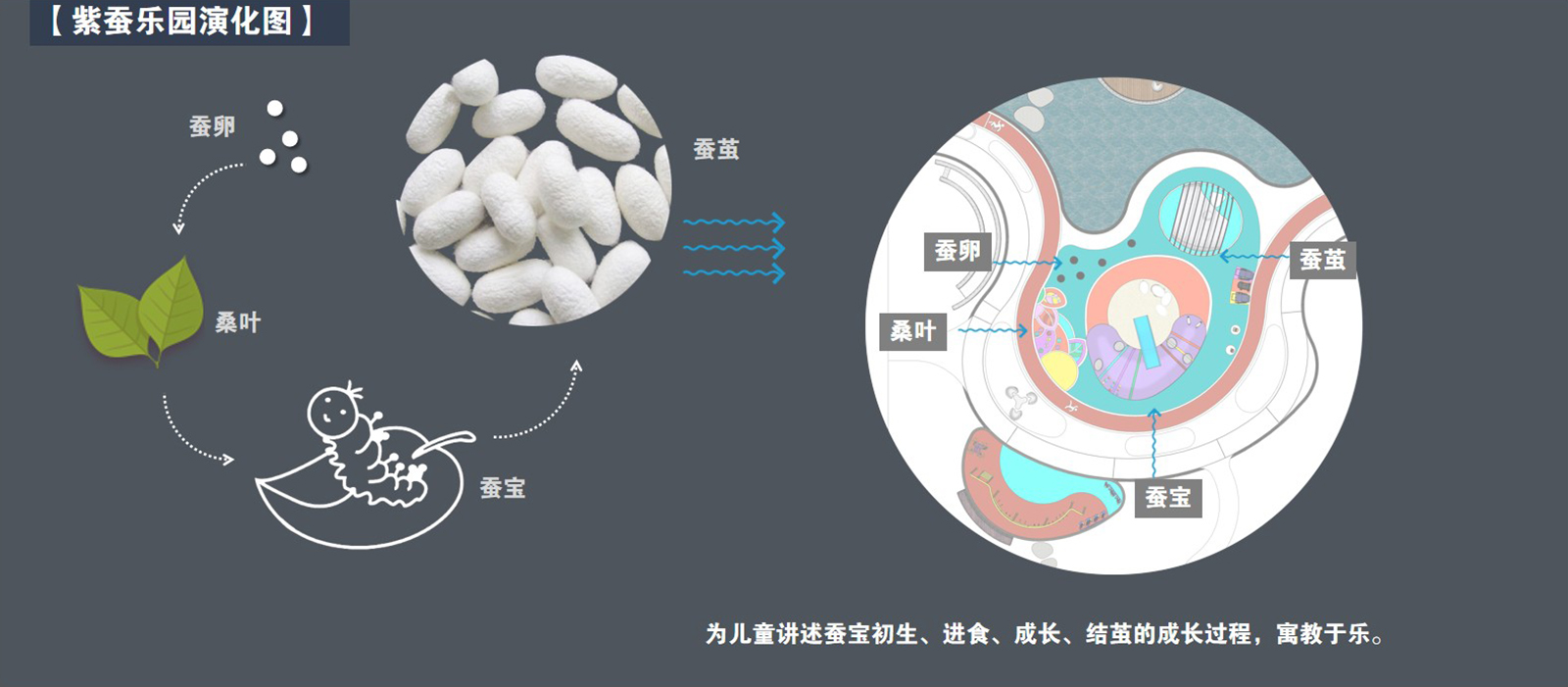 紫蠶兒童主題樂園以蠶寶寶的生長(zhǎng)演變過程為設(shè)計(jì)思路,整個(gè)樂園區(qū)域設(shè)計(jì)特別吸引眼球的是以“紫蠶”為主題形象創(chuàng)作的趣味鉆洞滑梯;