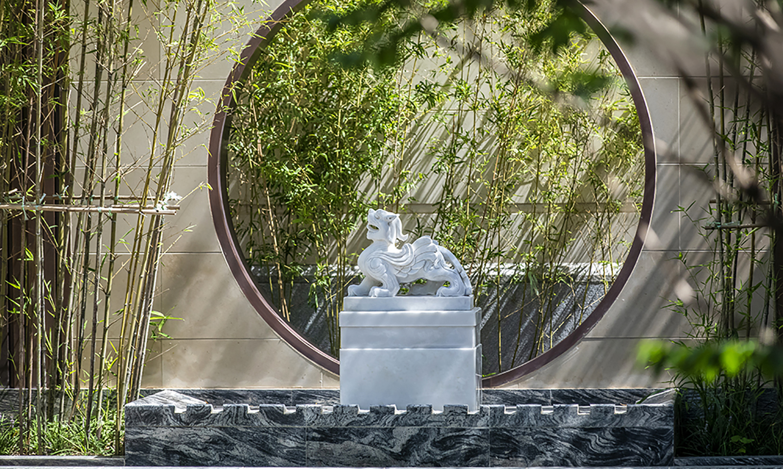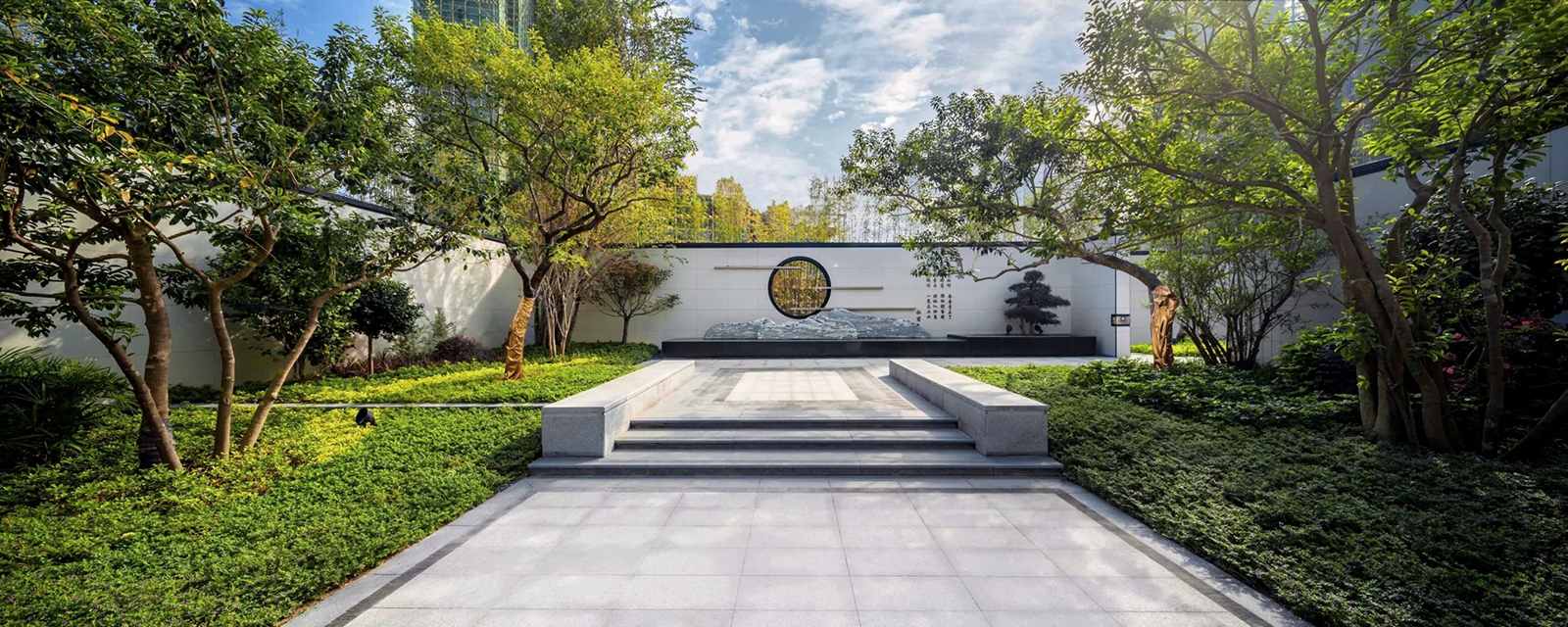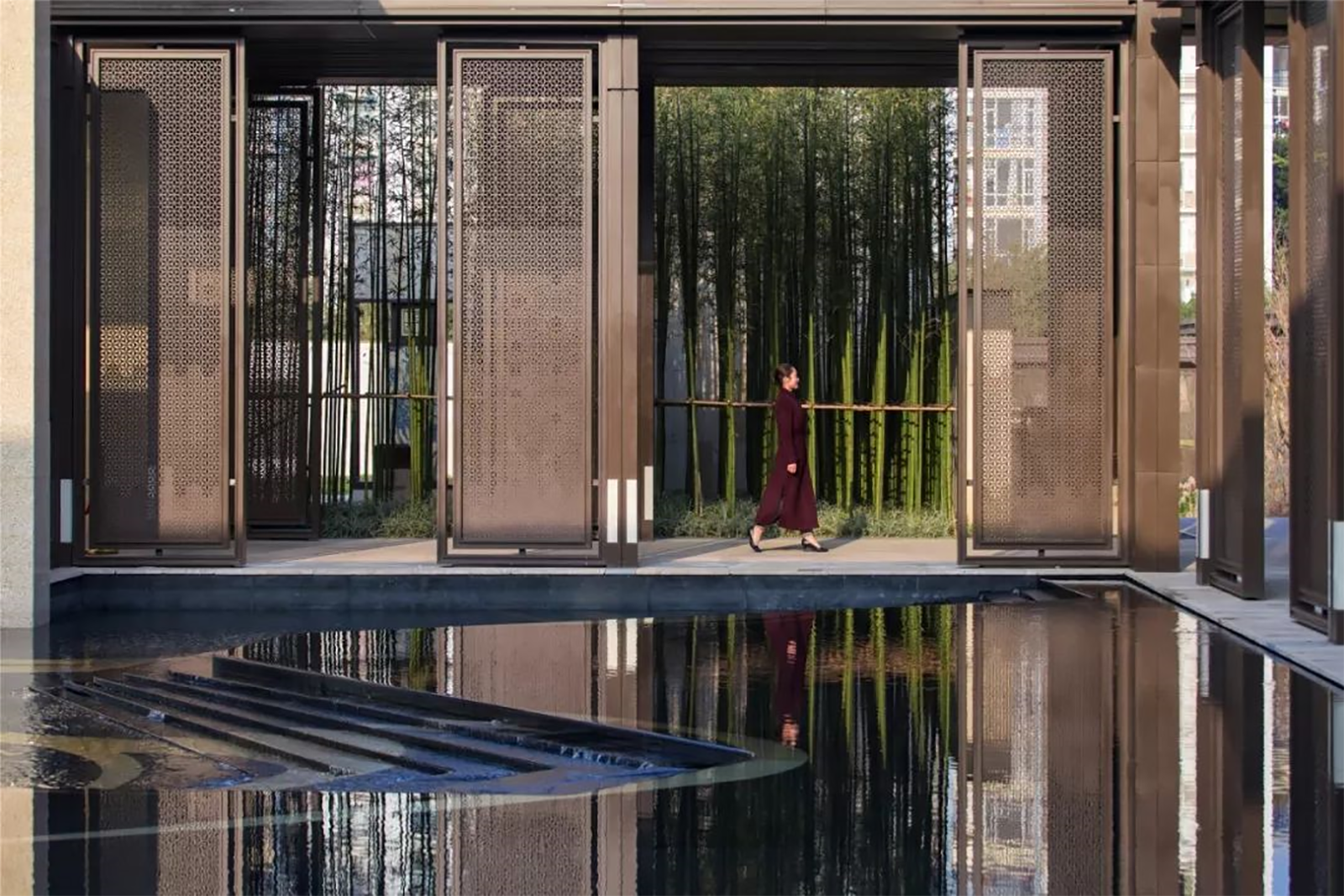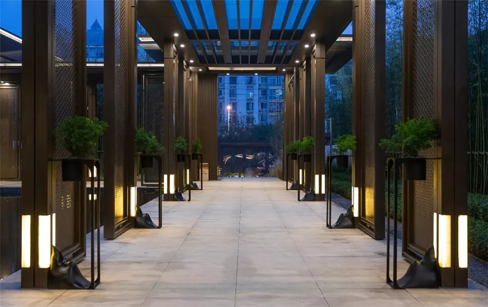 我們在傳統的一池三山枯山水基礎上,進行了創新,銅條追隨著山形,在湖石擺置之間,閃爍著迷人的光彩。 整個盛世華府秉承貴雅、輕奢國風設計元素,打造墨染閑庭的文學氣質,尊貴氣派的新人文院館。