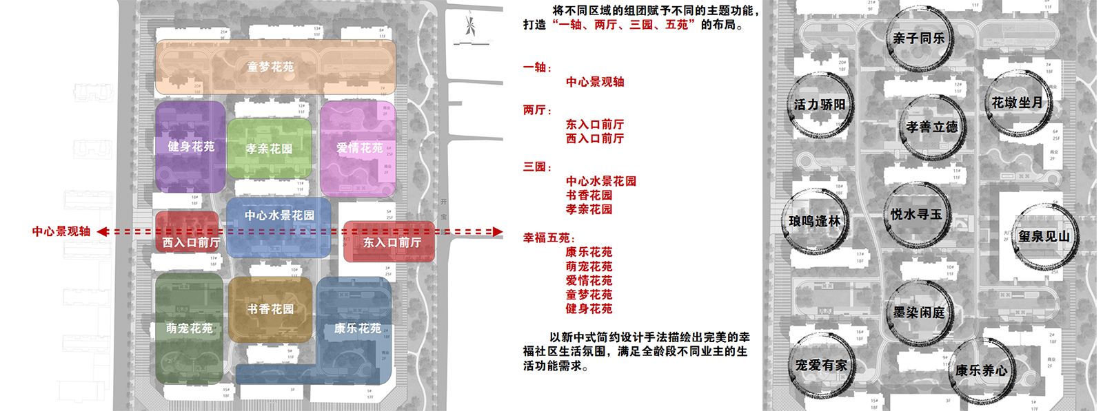 》》》》一軸:提煉東西兩大入口,結(jié)合中心花園,將其形成一條主軸線,將禮儀與尊貴通過軸線展現(xiàn)出來(lái),一軸定鼎璽瑯恢宏氣度,東方府境,園林與人文纏綿交織,山與水二物,人于園擷趣,或風(fēng)或雅,賞心悅事,以此表現(xiàn)出璽瑯府的寓意和尊貴。