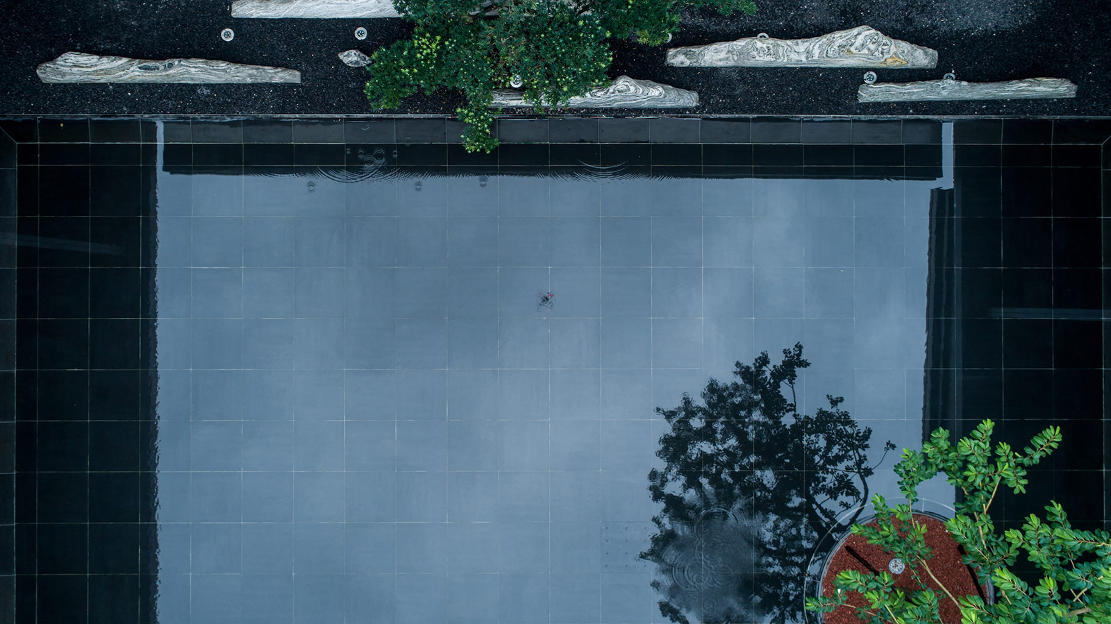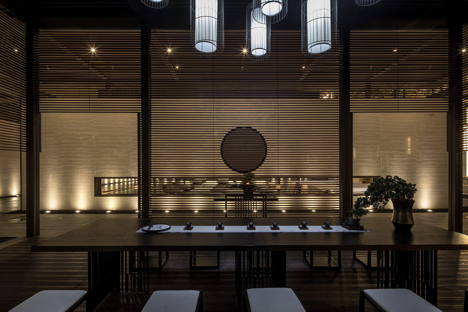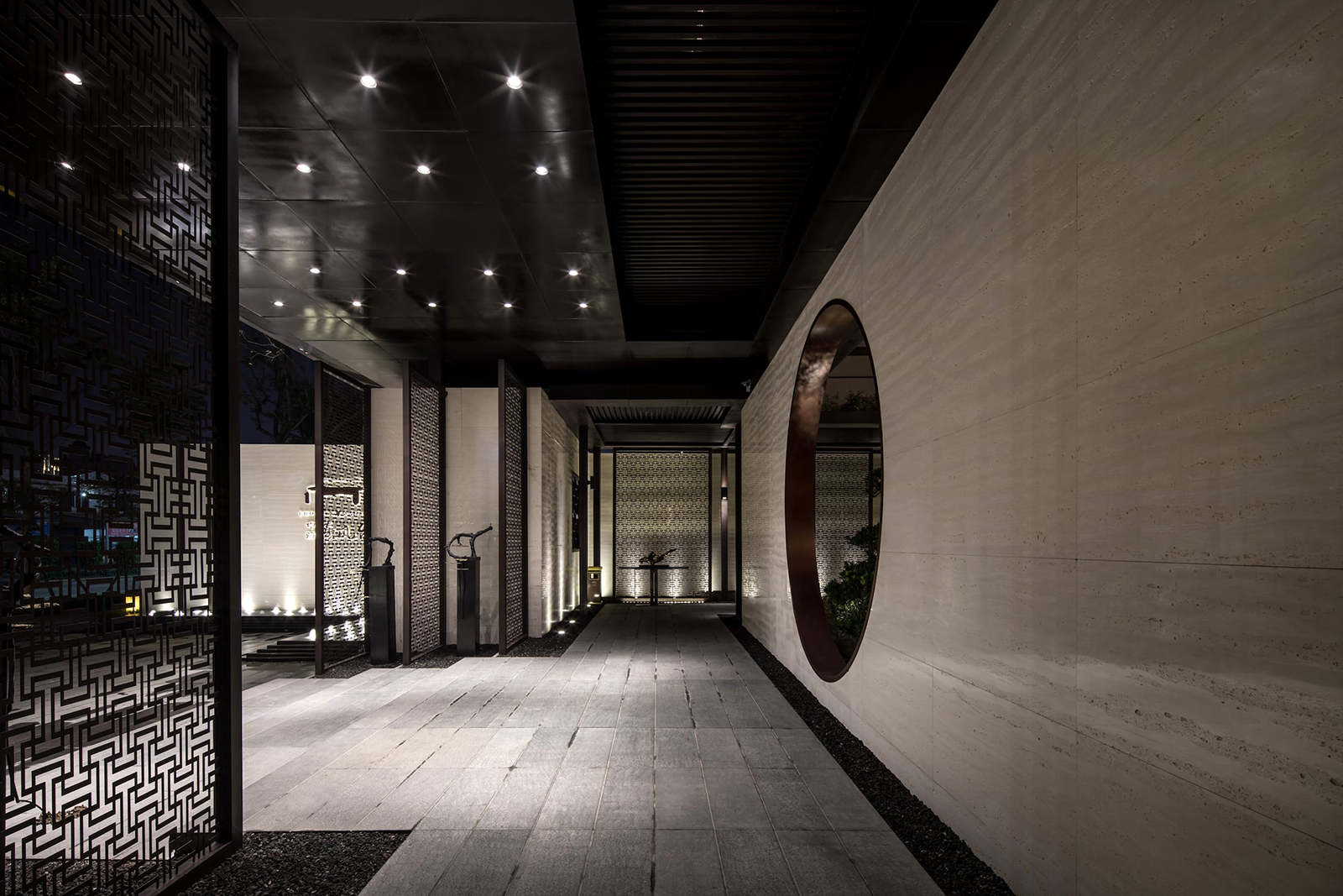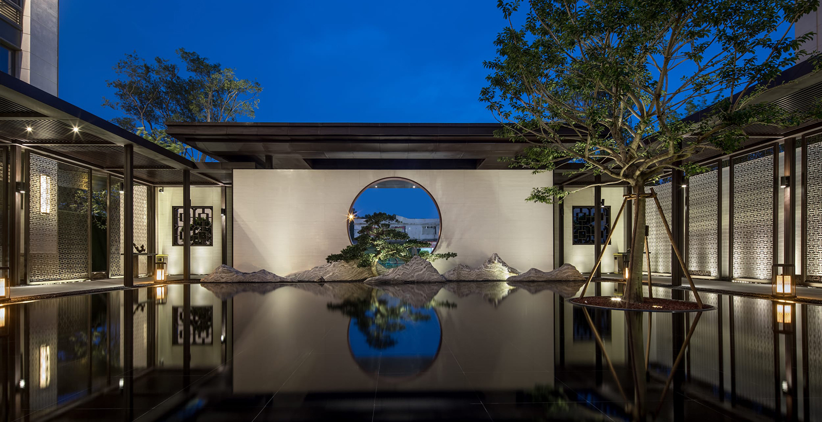中心水景花園作為中軸核心,東入口向園而行,途徑極具東方雅韻的禪意枯山水,一橋轉(zhuǎn)折入境,借新中式設(shè)計(jì)手法,由虛轉(zhuǎn)實(shí),虛實(shí)絞合,將山水理念融匯其中,鏡水回廊營(yíng)造水天大境,張弛有度的描繪一幅大氣優(yōu)雅的現(xiàn)代山水畫卷。意境脈絡(luò)從西入口至中園同樣的上演:穿過屏風(fēng)、月洞景墻,藏著一片唯美山水畫境:水廊鏡天、松石浮玉皆歸此園。不分遠(yuǎn)近,不知高下,月洞之后,更像一個(gè)故意的偶然,一點(diǎn)點(diǎn)構(gòu)建游園的驚喜。