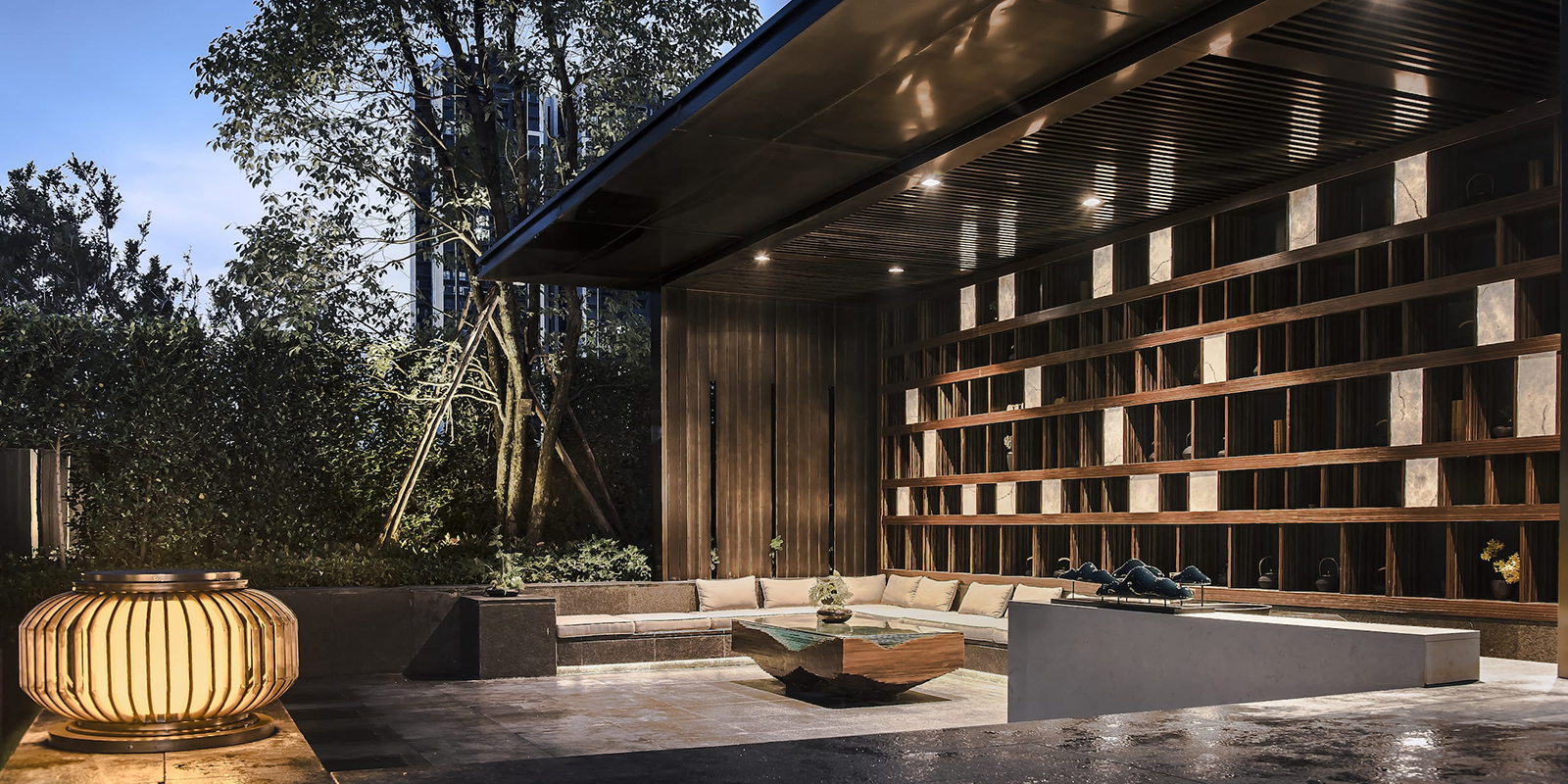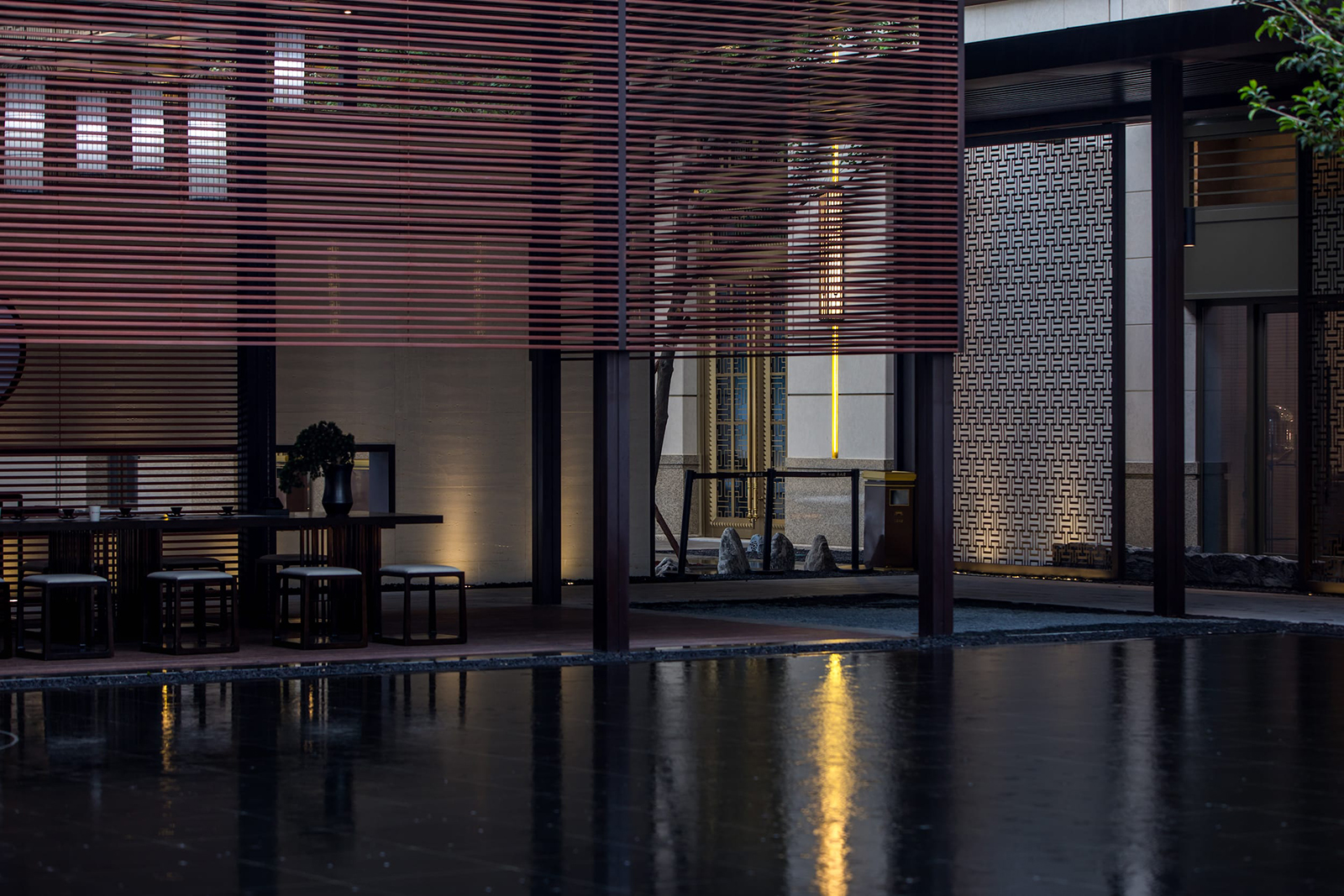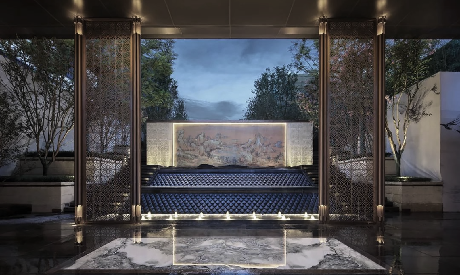 府院境的林泉是文人的林泉,將山水的形意融入到方寸的玉器上是古人表達(dá)喜愛的方式。西入口借助5.45米的內(nèi)外高差,采用六寶歸家禮制,門頭、御燈、光階、疊水、照壁、三山六大景觀元素,禮溯一宅風(fēng)水,規(guī)制禮儀,疊水瑯瑯如玉鳴,千里江山圖絹畫山水照壁,格柵之后設(shè)一池三山枯山水制境,兩側(cè)林蔭成趣,猶如境入山林,將臺(tái)、池、壁、光影等意境提煉、演化并植入場(chǎng)地,再現(xiàn)一幅具有文人林泉形意的現(xiàn)代山水畫卷。