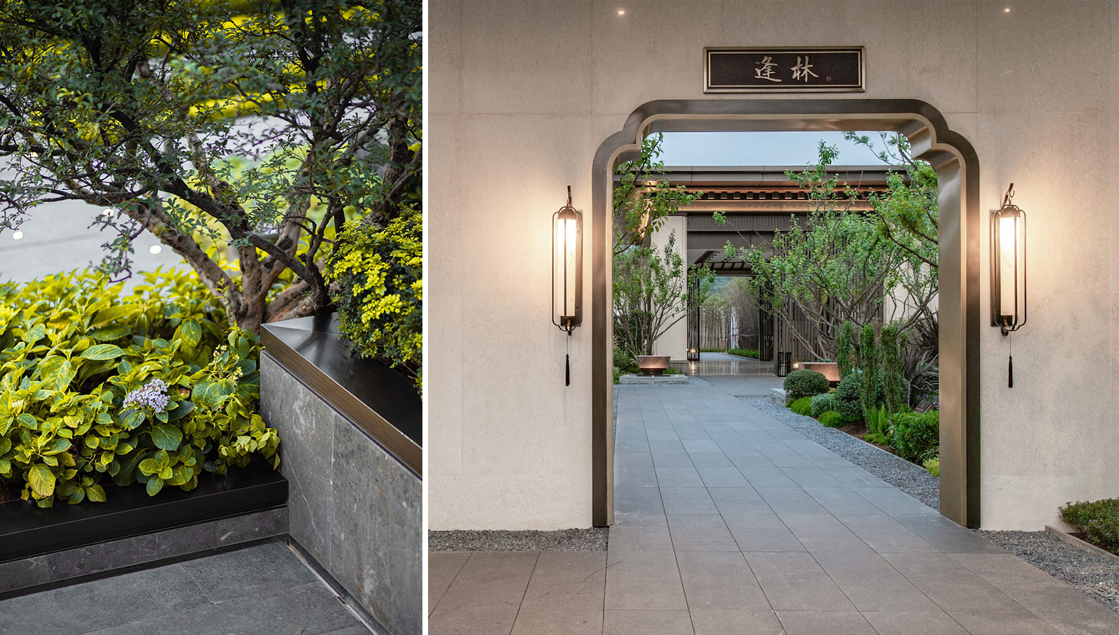 居者歸家,表現(xiàn)一個(gè)府系主題的入口,通常是厚重的。若想舉重若輕的傳達(dá)府園的高貴感,文化意境的融入和儀式感的空間轉(zhuǎn)換應(yīng)不可或缺。