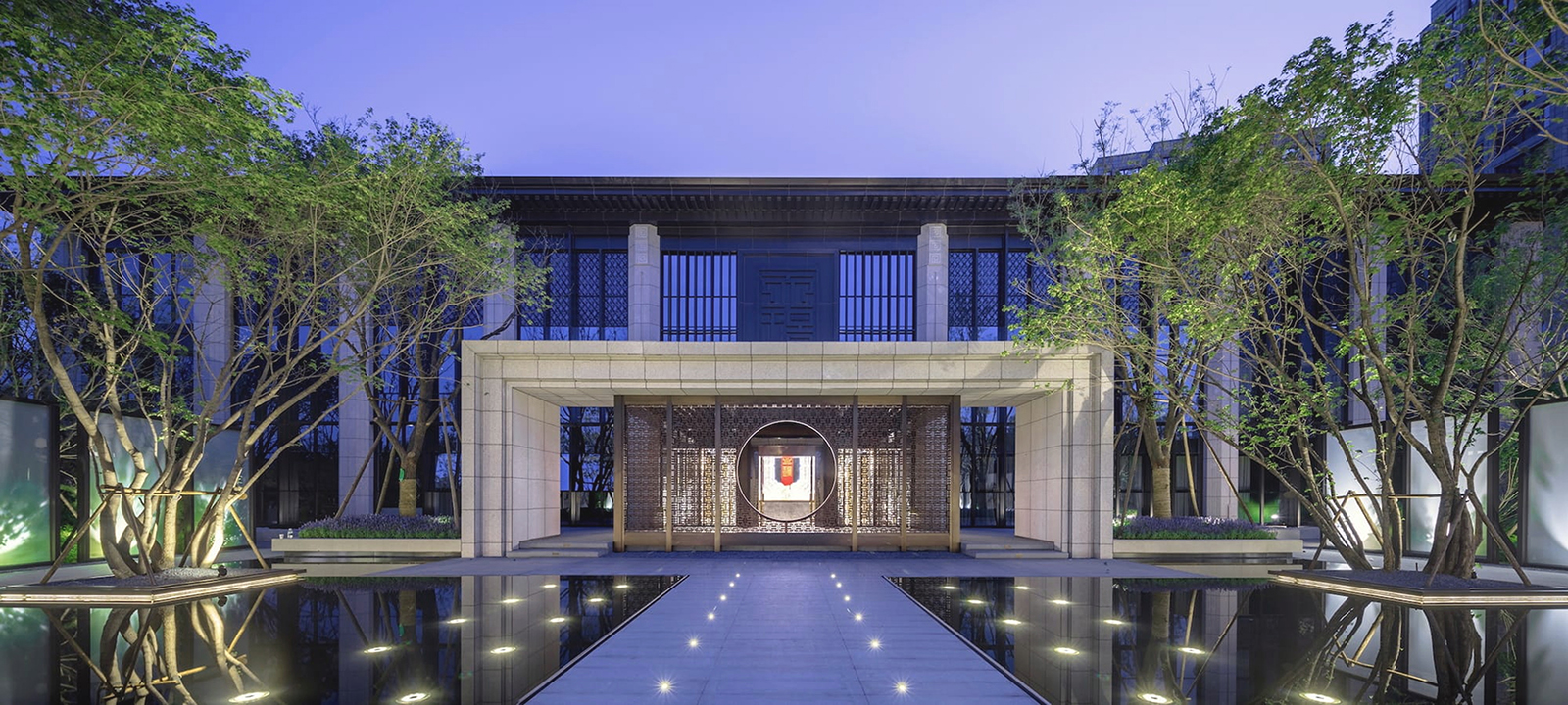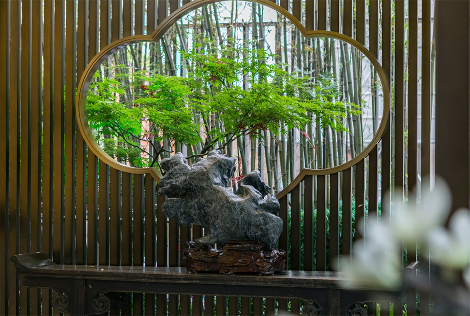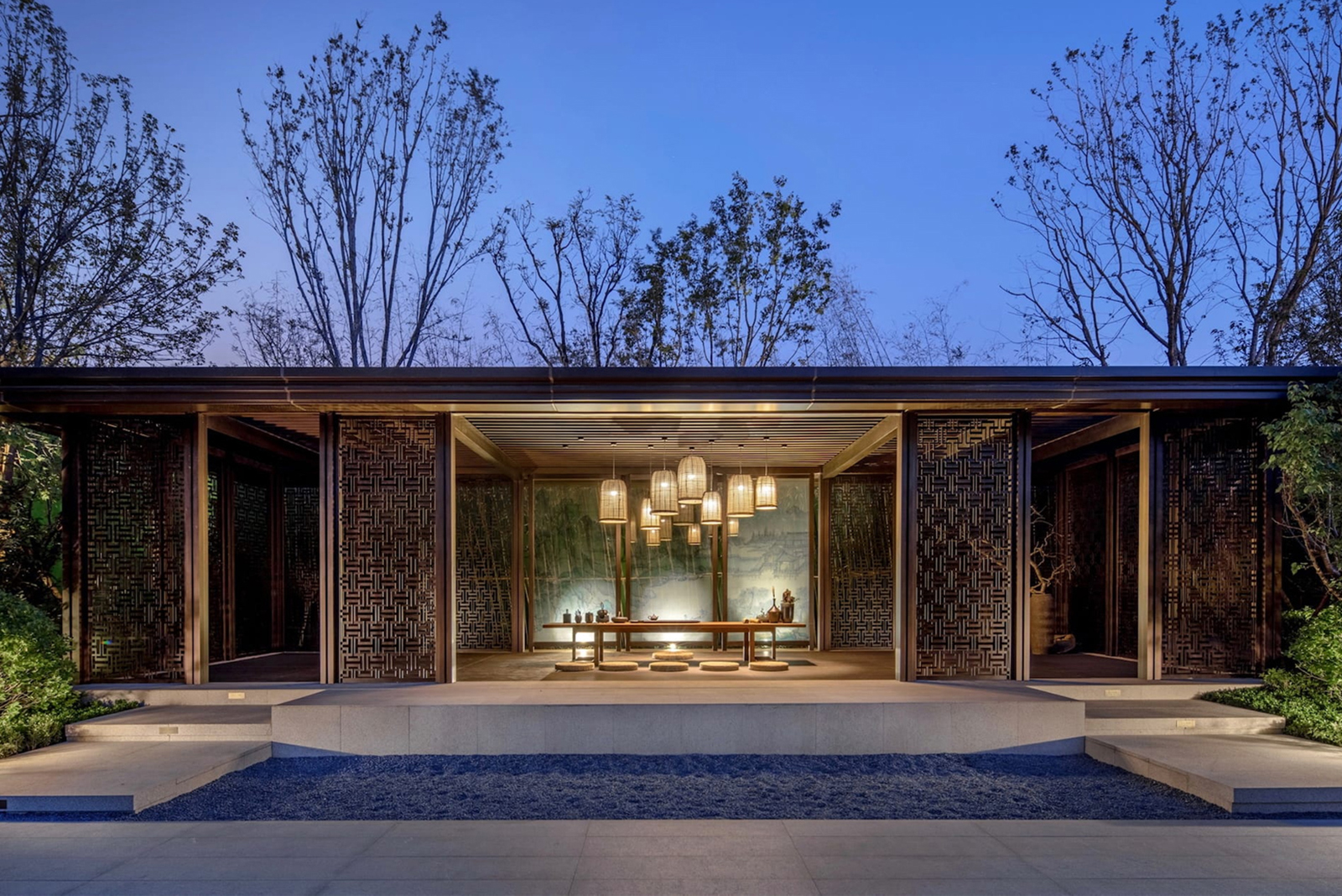 格柵與鏡面水景、絹畫屏風以朝夕光影,輝映秀美瀟湘河山,居者尊享禮儀、景致優(yōu)雅靜謐、從容唯美。