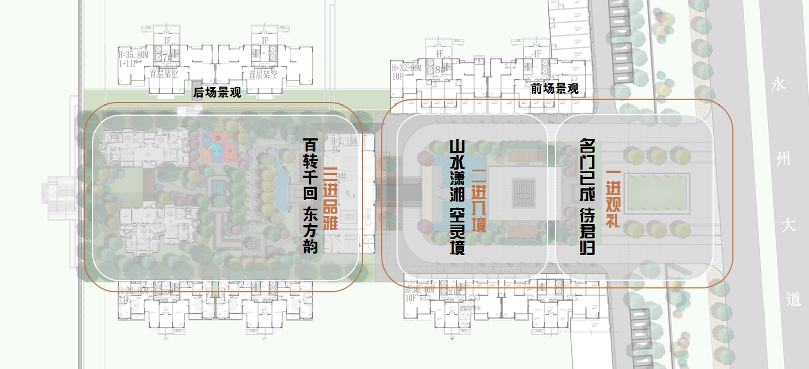 后場景觀采用環(huán)繞式、迂回的設計手法,在有限的空間內拉長整個后場景觀游線,猶如百轉千回,為業(yè)主描繪一個更加從容、舒緩的生活節(jié)奏,一襲東方雅韻,為業(yè)主打造全區(qū)第一品級的園林休閑空間,真正的心靈居所,靜享健康、詩意棲居生活。